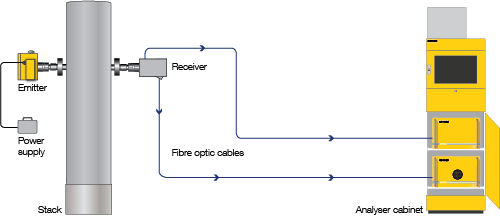 The OPSIS monitoring systems are based on gas analysers that have fast response times, are accurate, and require minimal maintenance. The monitoring takes place contact-free along light beams where gas molecules can absorb parts of the light. In process and emissions monitoring, light beams are sent through the gas channels that lead to the stacks, or some of the gases are led into measurement cells through which the light is sent. The light is captured and led via optical fibres to the analyser which measures the absorption and calculates the gas concentrations.