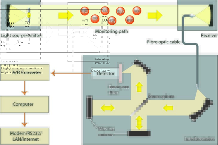The analyser used in the FTIR-DOAS technique contains a computer and associated control electronics just like an analyser for UV-DOAS, but instead of a spectrometer there is an interferometer. An interferometer is an excellent tool for monitoring the spectrum in the infrared region, but it does not work for ultraviolet light. The interferometer and the spectrometer, which are well suited for monitoring UV light, therefore complement each other, and thus the UV-DOAS and FTIR-DOAS techniques also complement each other.