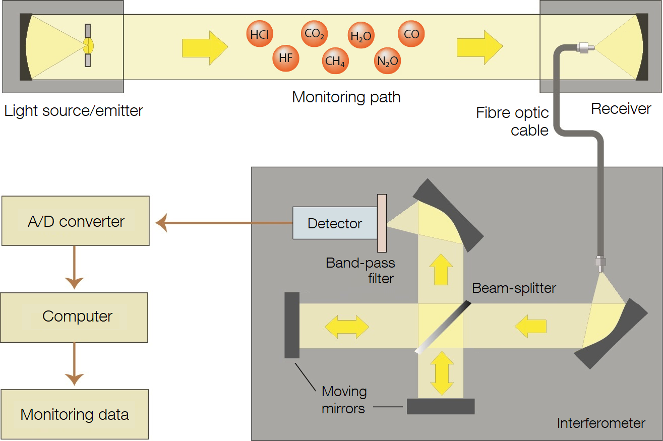 The analyser used in the FTIR-DOAS technique contains a computer and associated control electronics just like an analyser for UV-DOAS, but instead of a spectrometer there is an interferometer. An interferometer is an excellent tool for monitoring the spectrum in the infrared region, but it does not work for ultraviolet light. The interferometer and the spectrometer, which are well suited for monitoring UV light, therefore complement each other, and thus the UV-DOAS and FTIR-DOAS techniques also complement each other.