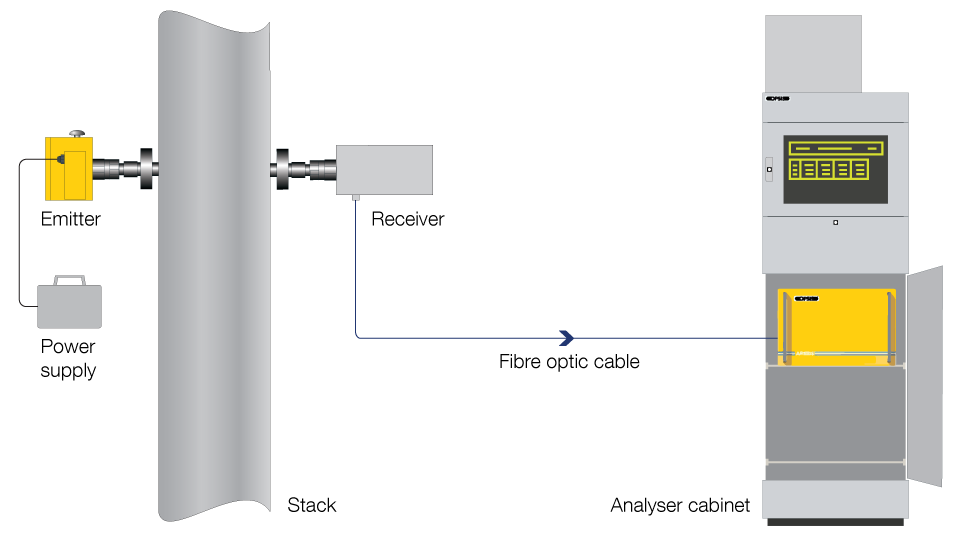 Each monitoring system is built around an analyser. Its task is to monitor the absorption of certain wavelengths of light coming from the monitoring path, and use this to calculate the concentration of different substances, such as NO, NH3, NO2, SO2, CO, CO2, HCl, and HF.