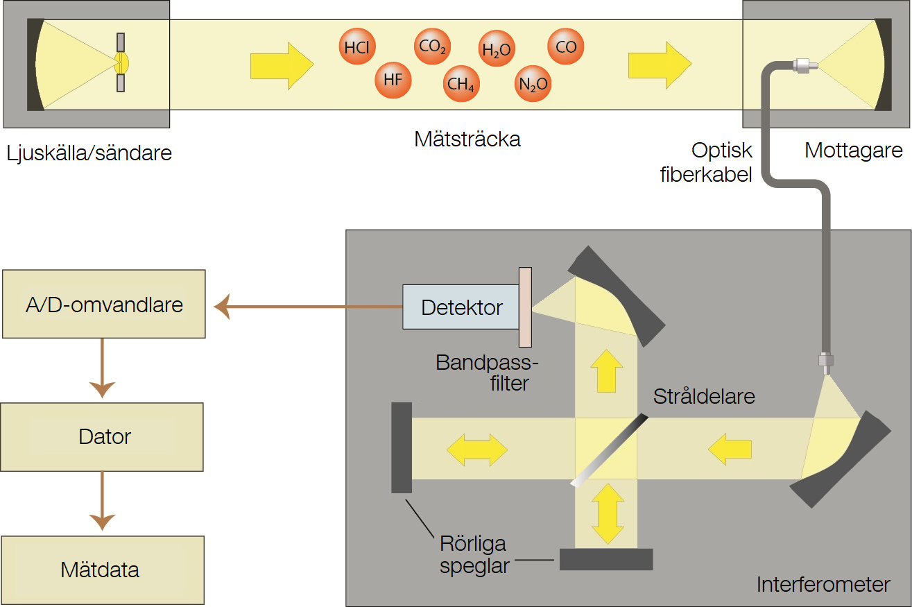 Precis som för UV-DOAS-tekniken så projiceras en ljusstråle mot en mottagare som vidarebefordrar ljuset via en optisk fiber till analysatorn. Precis som för UV-DOAS-tekniken absorberar olika typer av molekyler som befinner sig i ljusstrålen olika våglängder. Och det handlar åter om att mäta upp ett väl valt spektrum, fast nu i det infraröda våglängdsområdet. Faktum är att en och samma ljusstråle kan användas för att samtidigt förse ett UV-DOAS-instrument och ett FTIR-DOAS-instrument med ljus att analysera.