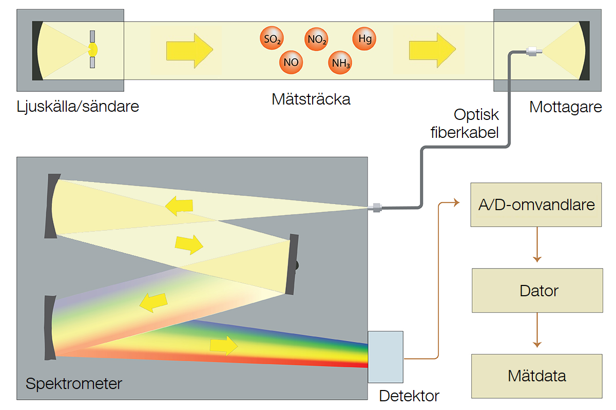 I UV-DOAS-tekniken projiceras en ljusstråle från en speciell ljuskälla - en högtrycks-xenonlampa - längs en mätsträcka. Ljuset från xenonlampan är mycket intensivt och innehåller både synliga, ultravioletta och infraröda våglängder. Det fångas upp av en mottagare och leds genom en optisk fiber till analysatorn. Den optiska fibern gör det möjligt att placera analysatorn på annan plats än mottagaren, som ibland är installerad i aggressiv miljö.