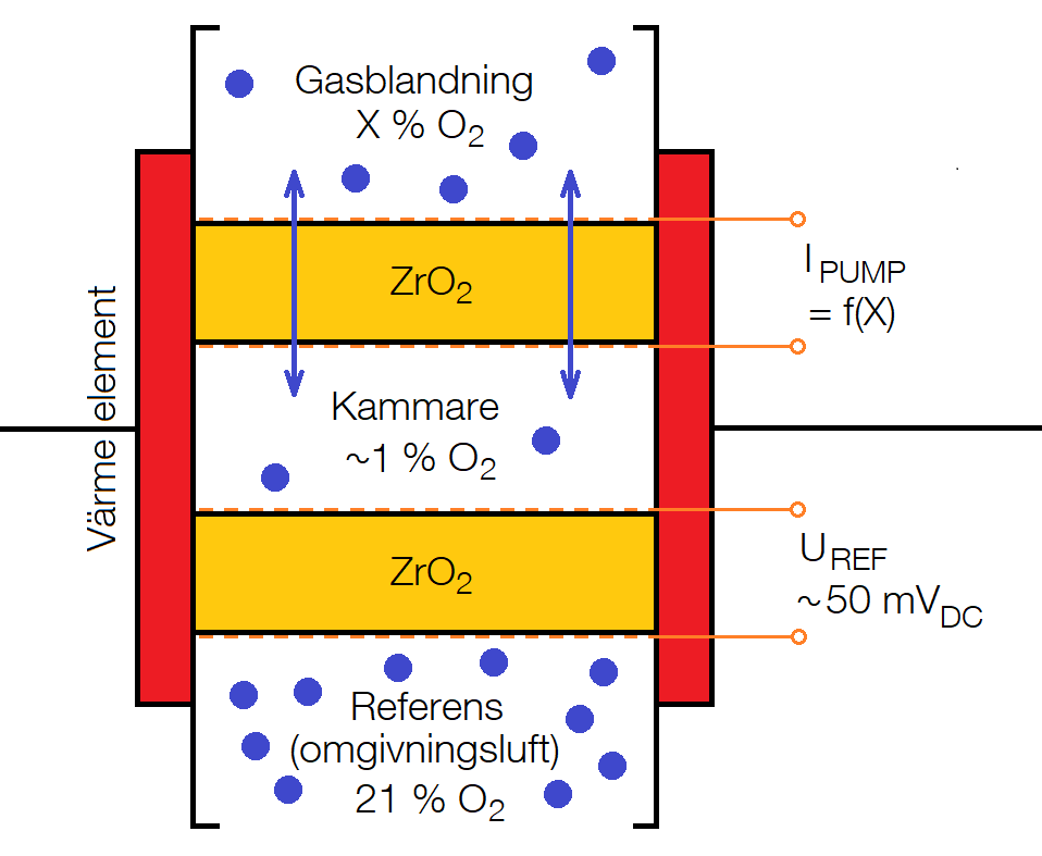 Zirkoniumdioxid är en mycket tålig keram som består av kristalliserat, oxiderat zirkonium, ZrO2. I grundutförandet förses ett litet block av zirkoniumdioxid med två elektroder på motstående sidor, detta bildar en ”cell”. Ena sidan med elektrod exponeras för en känd syrehalt (referens), oftast omgivningsluftens 21 %, och den andra sidan exponeras för den gasblandning vars syrehalt man vill bestämma. När cellen värms upp ger skillnaden i syrehalt mellan de två sidorna upphov till en elektrokemiskt inducerad potentialskillnad (spänning) mellan elektroderna. Spänningen varierar med skillnaden i syrehalt och genom att mäta spänningen kan syrehalten i gasblandningen bestämmas.