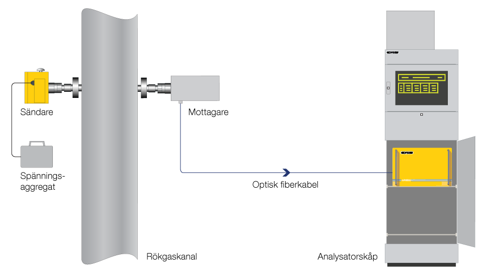 Ett grundläggande system för mätning av gaskoncentrationer i omgivningsluften består av en analysator, ett sändar-/mottagarpar, och en optisk fiberkabel som förmedlar ljuset till analysatorn. Systemet kan konfigureras för att mäta ett stort antal gasformiga ämnen. En och samma analysator kan mäta halterna längs flera olika mätsträckor. Sammantaget ger detta ett komplett mätsystem som är både mångsidigt och kostnadseffektivt. Läs mer på sidan om färdiga paketlösningar.