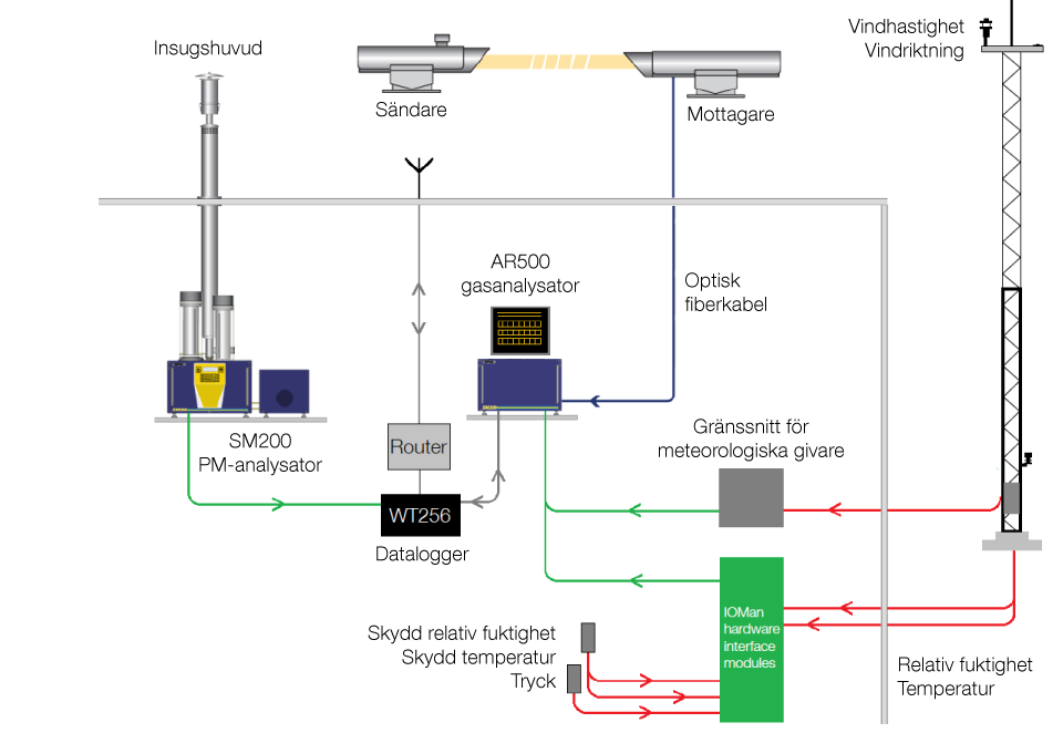 OPSIS gas- och partikelanalysatorer, IOMan-gränssnitt och internetanslutna dataloggrar gör det möjligt att skapa kompletta mätstationer för insamling och förmedling av all typ av mätdata relaterade till luftkvalitet. Illustrationen här intill ger ett exempel på ur det kan se ut med en AR500 DOAS-gasanalysator, en SM200 partikelanalysator, ytterligare givare anslutna till IOMan-moduler, och en WT256 som gränssnitt mot internet. En mätstation kan vara enklare men OPSIS har även levererat, installerat och driftsatt betydligt större och mer komplicerade system än så här.